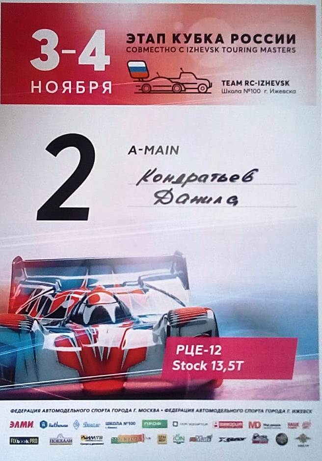 Опубликовано: 05.11.2018В период осенних каникул с 3 по 4 ноября 2018 года в г. Ижевске прошёл этап Кубка России по автомодельному спорту. В соревнованиях приняли участие 47 пилотов с 51 моделью из городов - Москва, Ижевск, Глазов, Альметьевск, Киров, Пермь, Добрянка и Екатеринбург. Наш город представил автомоделист Станции юных техников - Кондратьев Данила. Он выступил достойно, став победителем в классе моделей РЦЕ-10 Stock 17.5Т (WGT) и призёром в классе моделей РЦЕ-12 Stock 13.5Т.
