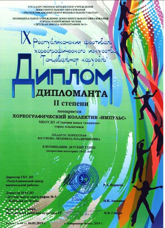 Опубликовано: 04.03.20192 марта 2019 года обучающиеся объединения «Импульс» под руководством педагога дополнительного образования Юсуповой Л.В. выступили на конкурсе "Танцевальная карусель" г. Набережные Челны" и стали дипломантами I и II степени.