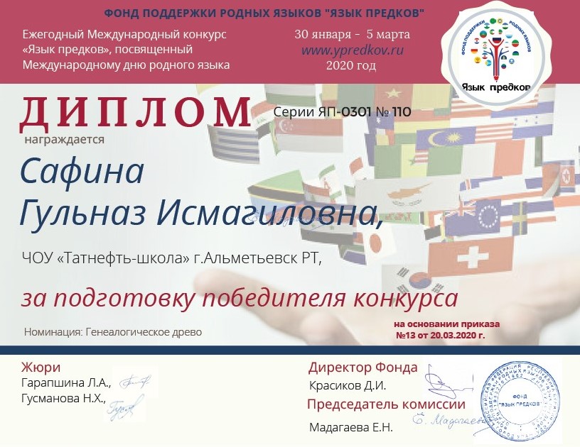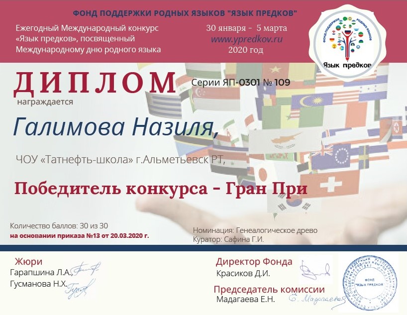 С 30 января по 5 марта 2020 года Фонд «Язык предков», созданный для поддержки родных языков народов, проживающих на территории России, проводил ежегодный Международный конкурс «Язык предков», посвященный Международному дню родного языка. На конкурс поступило 359 работ из разных регионов России и стран ближнего зарубежья. Представлены почти 20 языков разных народностей.Галимова Назиля, ученица 4 класса ЧОУ «Татнефть-школа», участвовала в этом конкурсе и стала победителем конкурса – Гран При в номинации Генеалогическое дерево! 30 баллов из 30! -