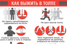 Террористы часто выбирают места массового пребывания людей. Помимо поражающего фактора террористического акта, люди гибнут и получают травмы еще и в результате давки, возникшей вследствие паники. Поэтому необходимо помнить следующие правила поведения в толпе:- Избегайте больших скоплений людей.- Не присоединяйтесь к толпе, как бы ни хотелось посмотреть на происходящие события.- Глубоко вдохните и разведите согнутые в локтях руки чуть в стороны, чтобы грудная клетка не была сдавлена.- Стремитесь оказаться подальше от высоких и крупных людей, людей с громоздкими предметами и большими сумками.- Любыми способами старайтесь удержаться на ногах.- Не держите руки в карманах.- Двигаясь, поднимайте ноги как можно выше, ставьте ногу на полную стопу, не семените, не поднимайтесь на цыпочки.- Если давка приняла угрожающий характер, немедленно, не раздумывая, освободитесь от любой ноши, прежде всего от сумки на длинном ремне и шарфа.- Если что-то уронили, ни в коем случае не наклоняйтесь, чтобы поднять.- Если Вы упали, постарайтесь как можно быстрее подняться на ноги. При этом не опирайтесь на руки (их отдавят либо сломают). - Старайтесь хоть на мгновение встать на подошвы или на носки. Обретя опору, "выныривайте", резко оттолкнувшись от земли ногами.- Если встать не удается, свернитесь клубком, защитите голову предплечьями, а ладонями прикройте затылок.- Попав в переполненное людьми помещение, заранее определите, какие места при возникновении экстремальной ситуации наиболее опасны (проходы между секторами на стадионе, стеклянные двери и перегородки в концертных залах и т.п.), обратите внимание на запасные и аварийные выходы, мысленно проделайте путь к ним.- При возникновении паники старайтесь сохранить спокойствие и способность трезво оценивать ситуацию.- Не присоединяйтесь к митингующим "ради интереса". Сначала узнайте, санкционирован ли митинг, за что агитируют выступающие люди.- Не вступайте в незарегистрированные организации. Участие в мероприятиях таких организаций может повлечь уголовное наказание.- Во время массовых беспорядков постарайтесь не попасть в толпу, как участников, так и зрителей. Вы можете попасть под действия бойцов спецподразделений