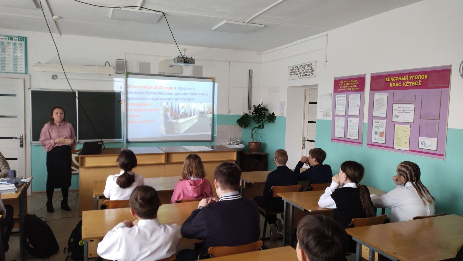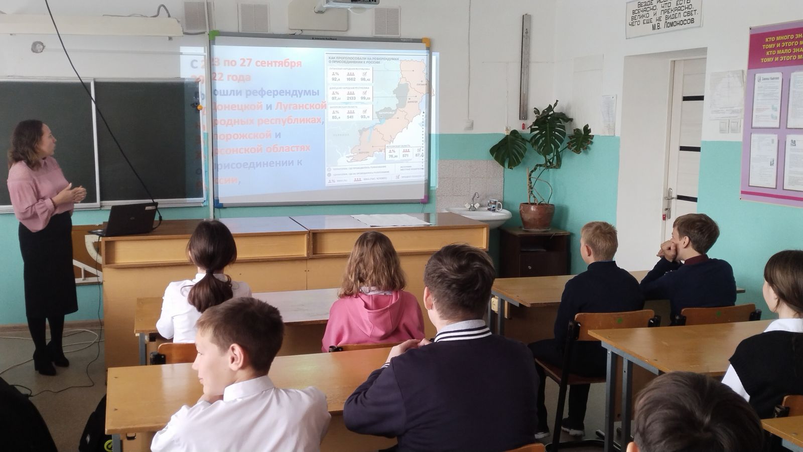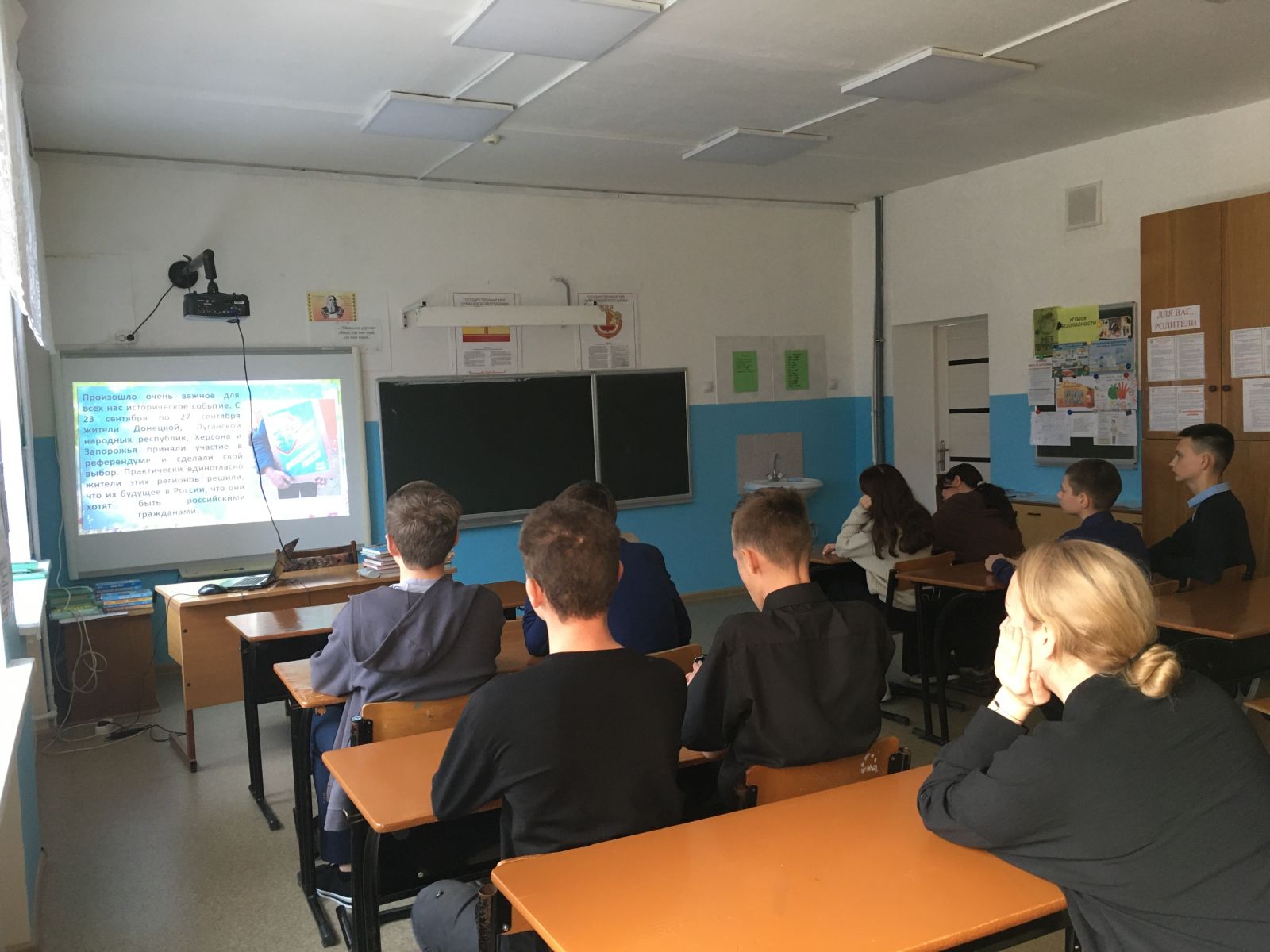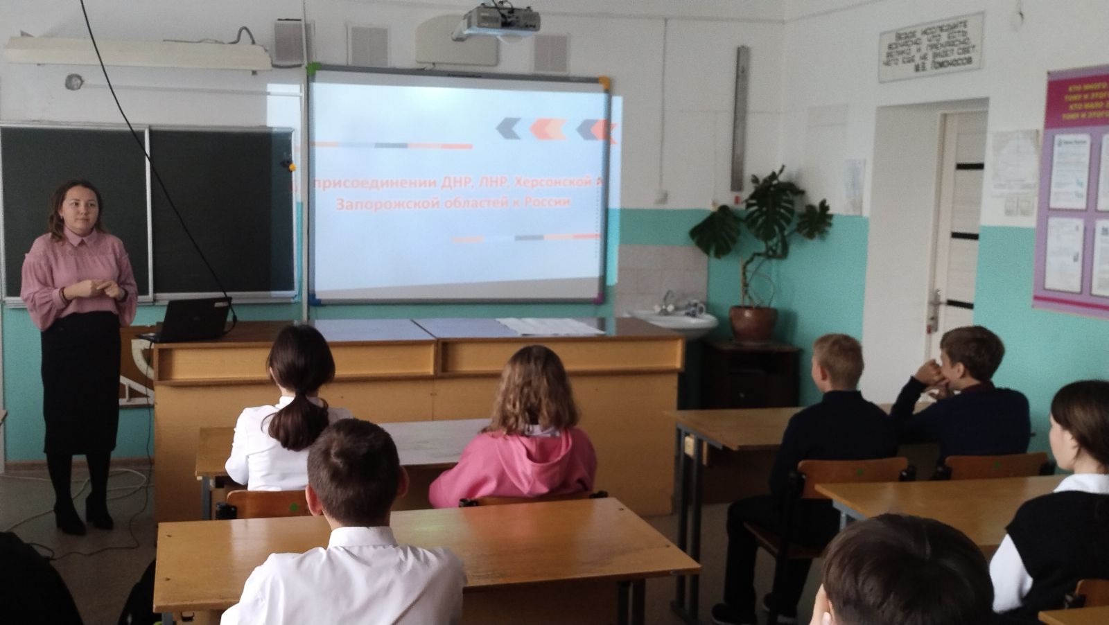 29 сентября в 1-11 классах был проведен единый классный час "Одна страна, одна семья, одна Россия!", приуроченный ко Дню воссоединения ДНР, ЛНР, Запорожской и Херсонской областей с Россией. Также была организована выставка, посвященная истории Донбасса и Новороссии.