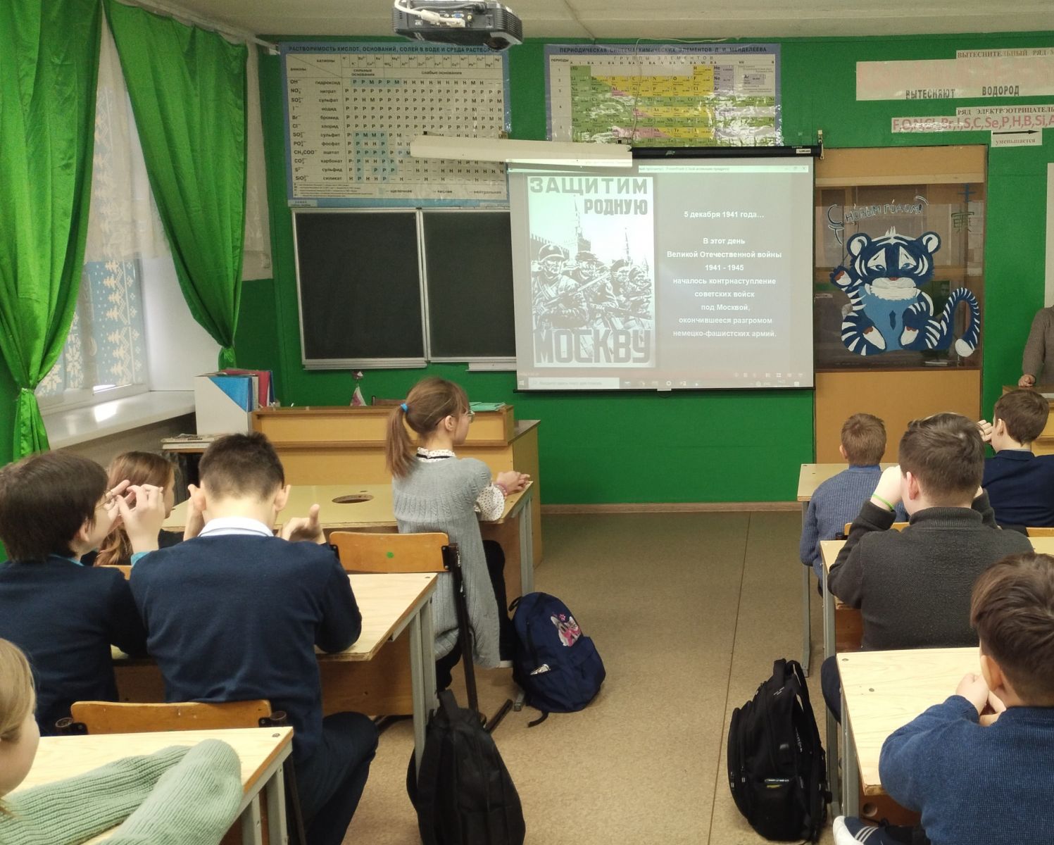 В рамках реализации плана подготовки и проведения мероприятий, посвященных 77 годовщине Победы в Великой Отечественной войне 6 декабря в 1-10 классах был проведен единый классный час "Контрнаступление советских войск под Москвой"