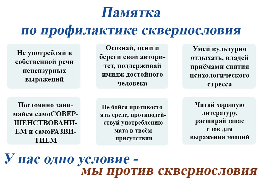 В целях формирования общепринятой в социуме лексике, цивилизованных форм общения и недопущения использования нецензурной лексике, 20 ноября 2020 г. в школе проведены классные часы, беседы.