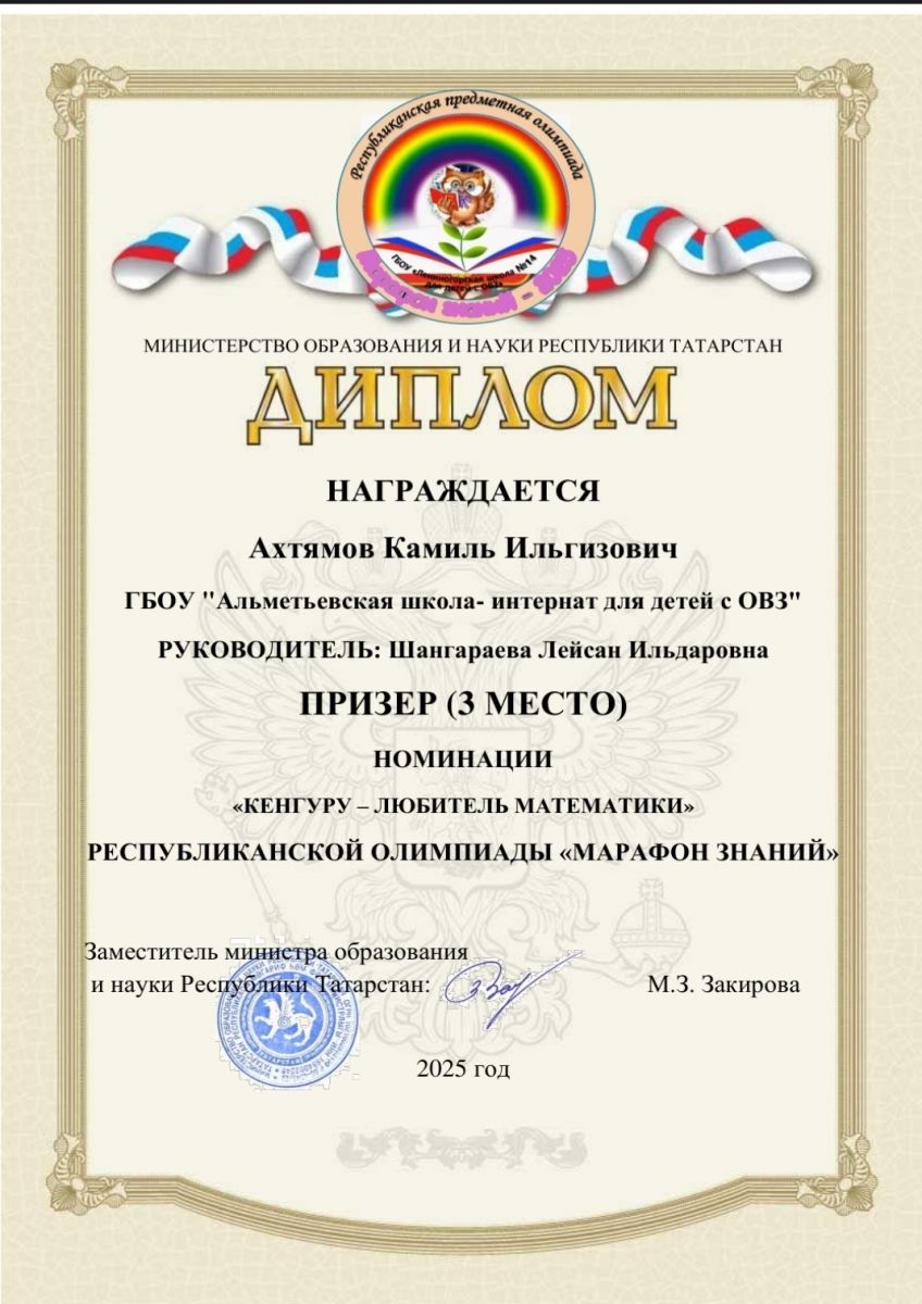 Ученики 9 класса (обучающиеся по программе вариант 1) Альметьевской школы-интерната приняли участие в Республиканской очной олимпиаде по математике для детей с нарушением интеллекта, которая состоялась в г.Лениногорске. Ахтямов Камиль занял 3 место. Учитель - Шангараева Лейсан Ильдаровна. Поздравляем!