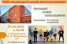 21 мая 2022 года в ГАПОУ "Альметьевский колледж физической культуры" состоится "День открытых дверей".Начало в 10.00 час.