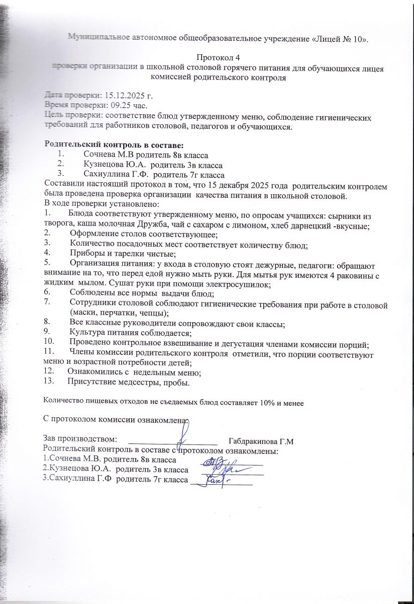 Родительский контроль за качеством питания в МАОУ "Лицей №10" от 15 декабря 2025 года