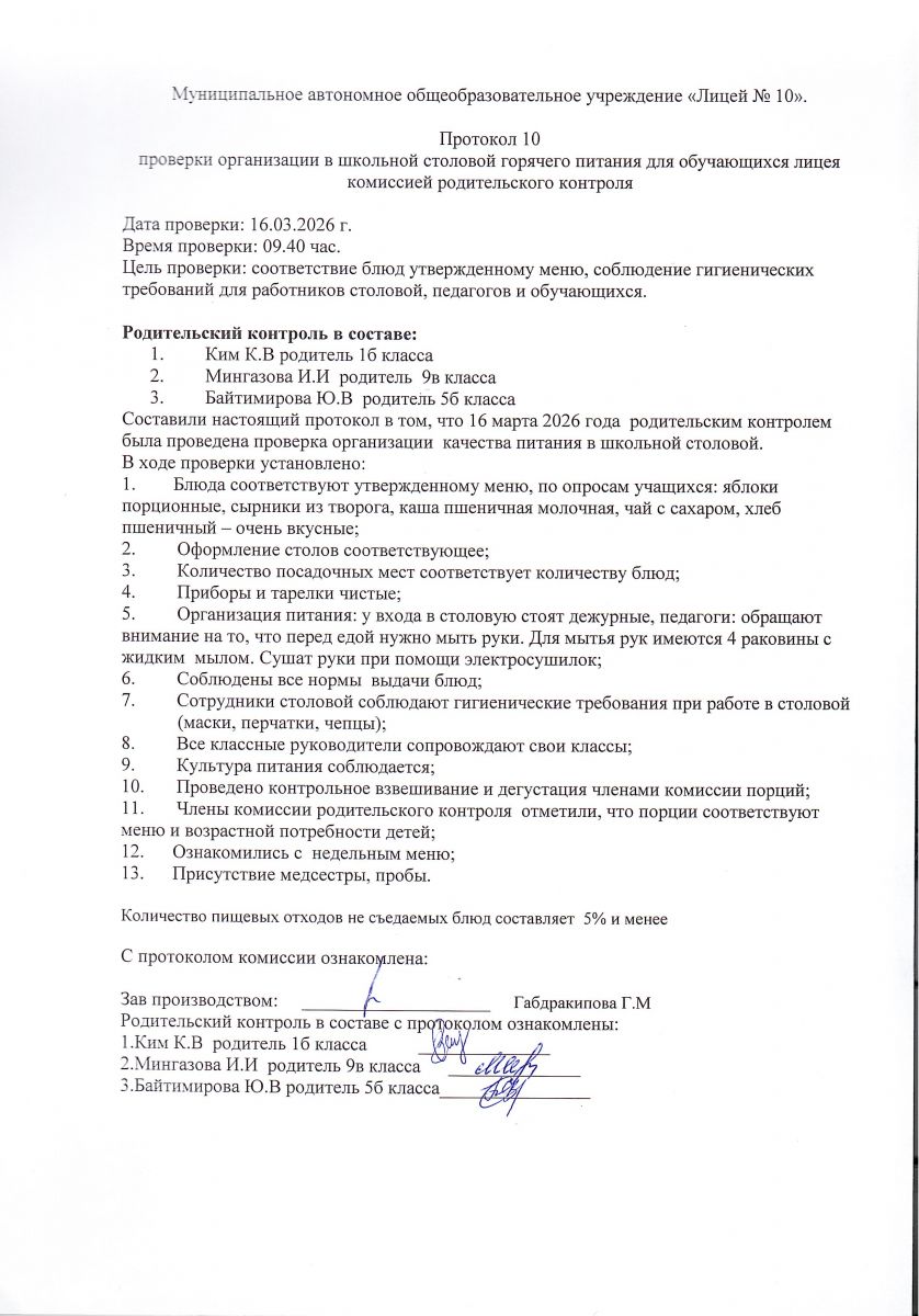 Родительский контроль за качеством питания в МАОУ "Лицей № 10" от 16 марта 2026 года