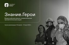 Российское общество «Знание» запускает Всероссийскую военно-патриотическую акцию «Знание. Герои», которая пройдет в период с 18 апреля по 31 мая 2023 года. Акция направлена на повышение знаний обучающихся школ, колледжей и вузов всех регионов страны о подвигах героев и достижениях страны, истории России и родного края.