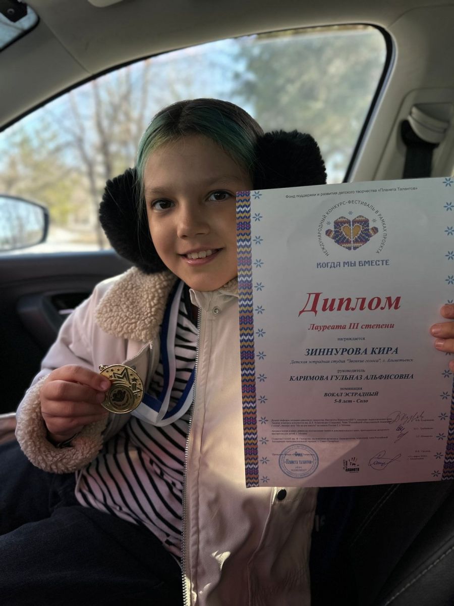 Поздравляем Зиннурову Киру с почётным 3 местом в международном конкурсе-фестивале в рамках проекта "Когда мы вместе".Желаем дальнейших творческих успехов!