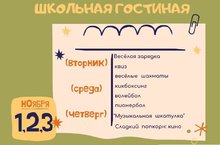 С 1 по 3 ноября в нашей школе будет проходить «Школьная гостиная». На протяжении этих дней дети будут посещать разные тренинги, мастер-классы, кружки, заниматься спортом. А каждый день будет заканчиваться просмотром увлекательных фильмов. Проведём каникулы вместе! Подробности далее...