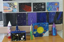 К празднованию Дня космонавтики в интересной и увлекательной форме подготовили выставку учащиеся, посещающие кружок «Страна мастеров» (руководитель Ширманова А.В.) и кружок по изобразительному искусству (руководитель Потапова М.Г.).Цель - закрепление и расширение знаний о космосе, о нашей Вселенной. Всё это дети отразили в разнообразной форме. Они с увлечением слепили из пластилина инопланетян, сделали ракету и макет планет. Также были сделаны рисунки, как дети представляют себе космос и космонавтов.
