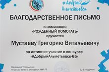 Благодарственным письмом в номинации «Рождённый помогать» был награждён волонтёр МАОУ «Гимназия №5», ученик 10-а класса Мустаев Григорий.