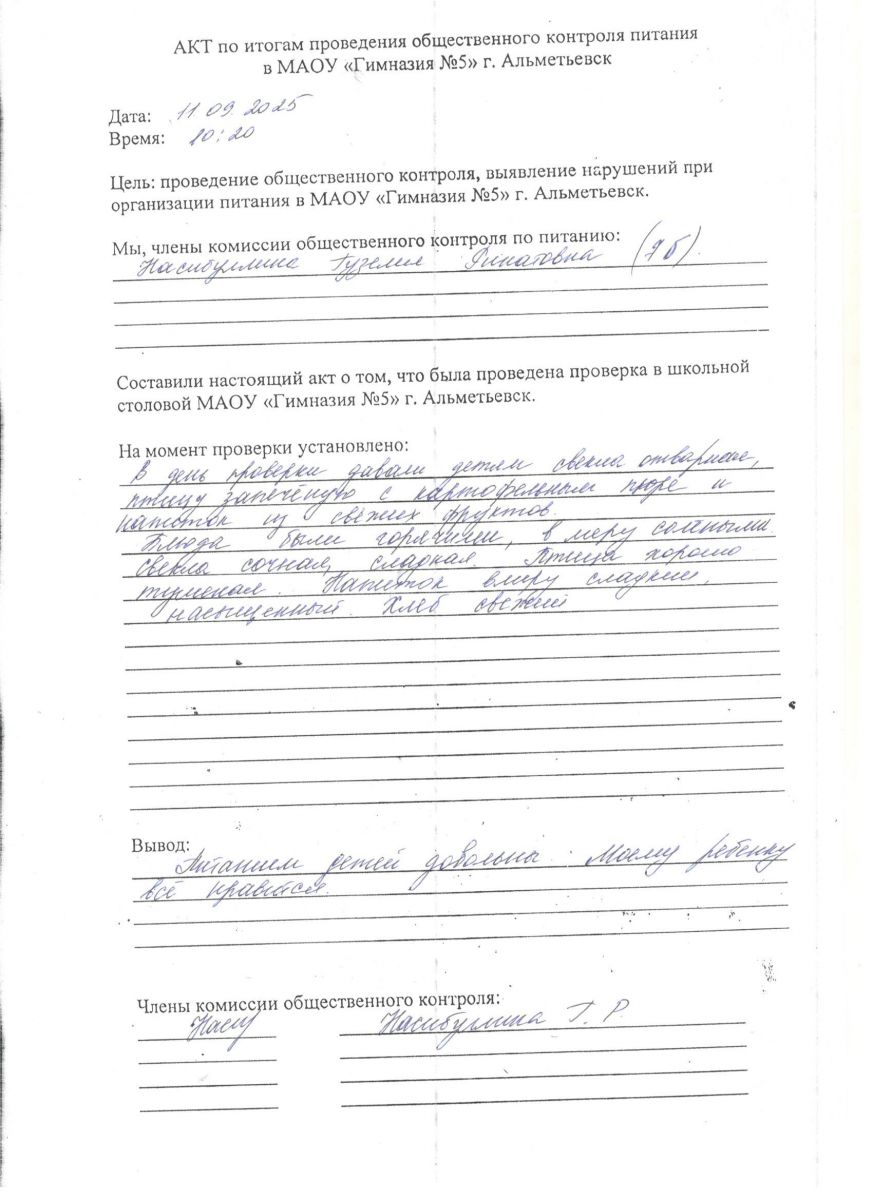 Акты по итогам проведения общественного контроля питания в МАОУ "Гимназия 5" 2025-2026 г. (сентябрь)