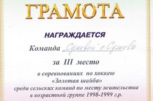 Команда нашей школы "Сулеевец" награждена Грамотой и медалью за 1 место в соревнованиях по хоккею "Золотая шайба" среди сельских команд по месту жительства в возрастной группе 1996-1997 г.р.