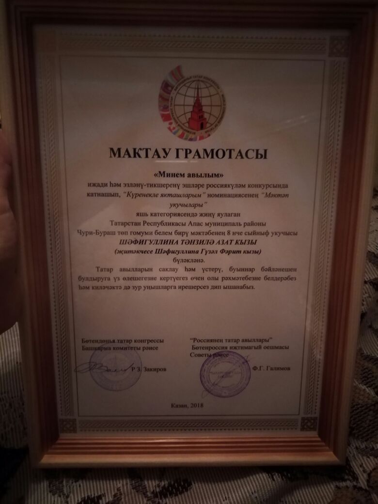 2018 елның 1 мартында Шәфигуллина Тәнзилә Казан шәһәрендә “Минем авылым” иҗади һәм эзләнү- тикшеренү эшләре россиякүләм конкурсында катнашып “Күренекле якташларым” номинациясенең “Мәктәп укучылары” яшь категориясендә җиңү яулап Мактау грамотасы белән бүләкләнде. Киләчәктә дә уңышлар сезгә!