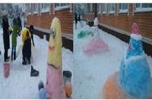 Мәктәп ишекалды балалар кулы белән эшләнгән кар сыннарыннан “Әкиятләр иле”нә әверелде.