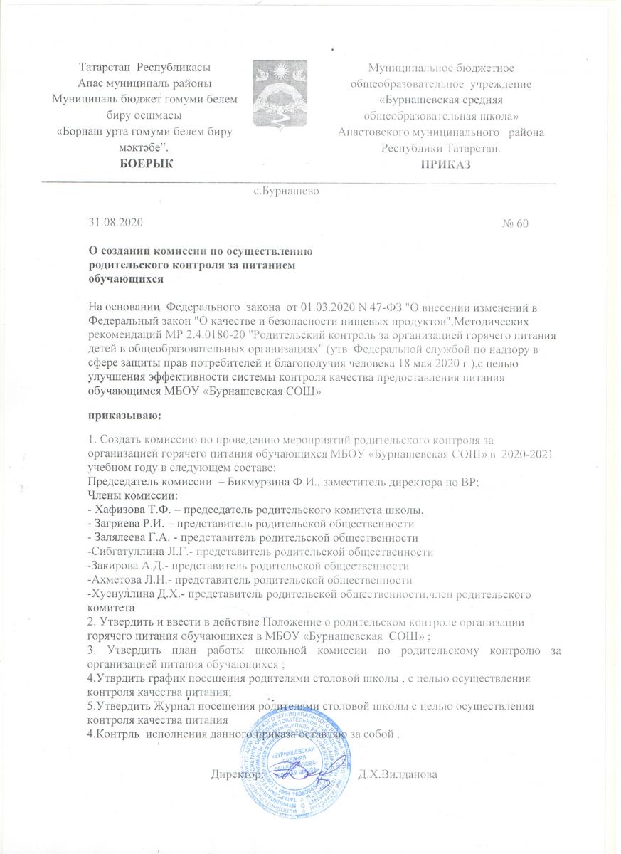 Приказ о создании комиссии родительского контроля