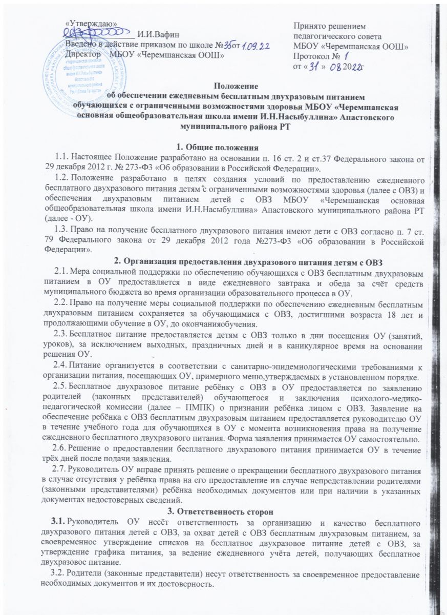 Положение об обеспечении ежедневным бесплатным двухразовым питанием обучающихся с ограниченными возможностями здоровья МБОУ «Черемшанская основная общеобразовательная школа имени И.Н.Насыбуллина» Апастовского муниципального района РТ