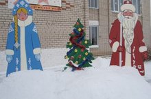 Всех учеников и гостей во дворе школы встречают Дед Мороз, Снегурочка и елочка.