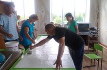 Родители учащихся 2 класса затеяли ремонт в классной комнате, где в следующем учебном году их дети будут обучаться в 3 классе. Папы и мамы дружно клеят обои.