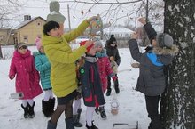 Башлангыч укучылары җимлекләрен мәктәп бакчасына элделәр. Аларга җим салдылар. -