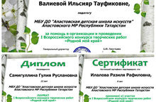 Учащиеся отделения ИЗО участвовали во Всероссийском конкурсе творческих работ "Родной мой край". Самигуллина Гулия получила диплом Лауреата, Илалова Разиля удостоилась сертификата участника (руководитель Валиева И.Т.)