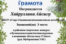 "Сәләт"балалар иҗат үзәге оештырган Яңа ел уенчыклары бәйгесендә безнең мәктәпнең 1нче сыйныф укучысы Хәйруллина Айсылу(җитәкчесе МубаракшинаЭ.М.) "Когда часы бьют 12" номинациясендә 3 урынны яулады. Айсылуны уңышлары белән тәбрик итәбез.