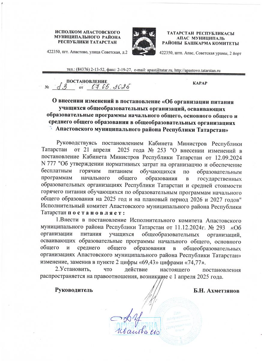 Постановление Об организации питания учащихся образовательных организаций № 293 от 11.12.2024г
