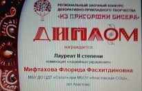 Региональный заочный конкурс декоративно- прикладного творчества "Из пригоршни бисера". Обьединение "Рукоделие" (рук.Мифтахова Флорида Фасхитдиновна) лаурет II степени в номинации "Нашейные украшения" . Поздравляем!!!