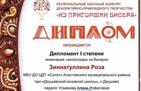 Региональный заочный конкурс декоративно- прикладного творчества "Из пригоршни бисера". Зиннатуллина Роза воспитанник обьединения "Самоцветы" (рук.Усманова Алина Ильфатовна) дипломант 1 степени в номинации "Аксессуары из бисера". Поздравляем!