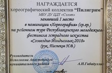 Танцевальный коллектив "Пилигрим" МБУ ДО ЦДТ "Сэлэт" занял II место в зональном этапе открытого республиканского телевизионного молодёжного фестиваля эстрадного искусства "Созвездие-Йолдызлык-2018" и приглашены на суперфинал, который пройдет с 8 по 13 апреля 2018 года в г. Казань.