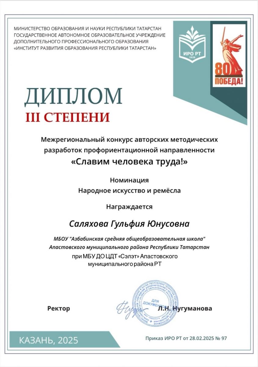Опубликовано: 03.03.2025Подведены итоги Межрегионального конкурса авторских методических разработок профориентационной направленности «Славим человека труда!», проведенного в рамках реализации задач Стратегии развития воспитания в Российской Федерации на период до 2025 года и в связи с празднованием 80-й годовщины Победы в Великой Отечественной войне 1941–1945 годов. Конкурс проходил с 10 января по 28 февраля 2025 года. Цель Конкурса — развитие системы профессиональной ориентации в дошкольных образовательных организациях, общеобразовательных организациях, профессиональных образовательных организациях, организациях дополнительного образования. Педагог дополнительного образования Саляхова Гульфия Юнусовна была награждена Дипломом 3 степени в номинации "Народное искусство и ремёсла".