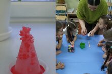 Ребята старшей группы вместе с воспитателем провели опыт, используя набор юного экспериментатора «Коралловый риф». Они наблюдали, как гранулы карбамида растворились в стаканчике с горячей водой и добавили яркие краски. Затем поместили в контейнер конус из специальной бумаги, через день или он покрылся кристаллами, похожими на кораллы.