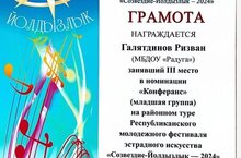 Поздравляем воспитанника средней группы Галятдинова Ризвана, занявшего 3 место в номинации конферанс на районном туре фестиваля "Созвездие - Йолдызлык"