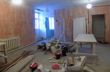 Обновление детского сада продолжается. С утра до позднего вечера у нас трудятся 31 рабочих. В помещении уже есть новое отопление, поставлены новые светодиодные светильники. Сейчас рабочие занимаются заливкой полов, штукатуркой стен, облицовкой.