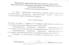 На основании постановления Исполнительного комитета Апастовского муниципального района РТ ДОУ временно закрывается с 1.01.2016 по 31.01.2016 года.