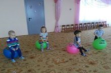Цель: познакомить детей с фитболом, его назначением; учить прыгать на фитболе, катать его двумя руками по полу; воспитывать интерес к занятиям по физической культуре.