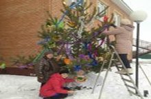 Сотрудники детского сада готовятся к Новому году. У входа в детский сал установили красавицу ёлку, украсили её новогодними игрушками.