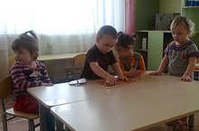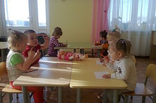 Сегодня дети на занятии учились рисовать фигурки цыпленка красками.