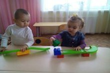 На занятии по конструированию дети ясельной группы построили мостик для машин.