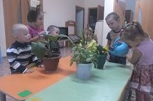 Утром с рано пришедшими детьми наблюдали за комнатными растениями, определяли части растений: корень, стебель, листья, цветочки. Как растет растение? Дети поливали цветы, вытирали пыль с листочков.