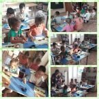 На занятии по рисованию дети старшей группы познакомились с акварельными красками. Затем узнали, что для рисования можно использовать и воздушные шарики. Опуская их в краску, затем на белый лист, можно получить интересные узоры.