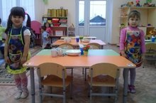 Мы дежурные сегодняСтанем няне помогатьАккуратно и красивоВсе столы сервировать -