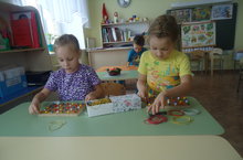 Дети подготовительной группы с удовольствием играют в игру " Цветные резиночки". Здесь можно составить и рисунок. и узор, и просто собрать резиночки по цвету.