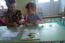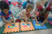 Дети подготовительной группы собирают математические пазлы; игру, которую для них сделали воспитатели. Для того чтобы получилась картинка, надо сложить пазлы по цвету и по порядку. Эта игра закрепляет порядковый счёт и цветовые оттенки.