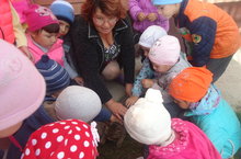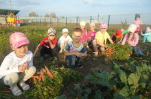 Дети подготовительной группы убирают урожай моркови.