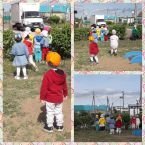 Дети ясельной группы на участке увидели как рабочие поднимались с помощью крана на крышу для ремонта. Это было очень интересно.