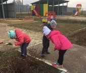 На прогулке дети помогают воспитателю убирать сухие веточки.