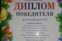 Ученица 2класса Садриева Язиля приняла участие в Республиканском творческом конкурсе для школьников 1-6 классов и награждена Дипломом победителя (рук. Бурганова Р.Т. Дипломом за подготовку конкурсанта)
