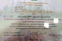 На августовской совещании педагогических работников Апастовского района МБОУ "Апастовская СОШ" была награждена сертификатом Главы района на сумму 3000 руб за высокие результаты ГИА-2018 и за победы на республиканских , всероссийских олимпиадах.